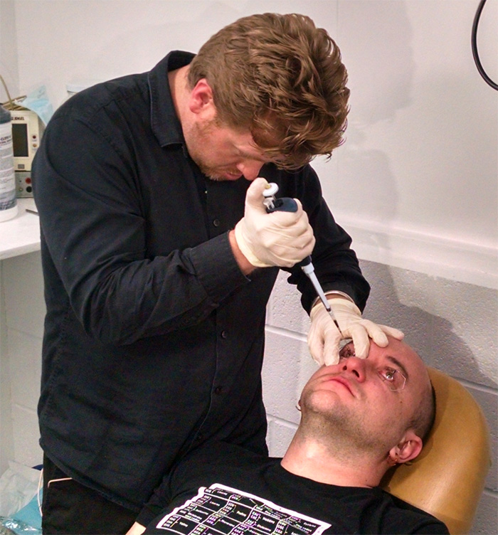 With Licina acting as the guinea pig, speculum was put into his eyes before the mixture is applied. This prevents his eyes from blinking so that the mixture drops get absorbed by the eye rather than pushed out when his eyelids instinctively close to prevent foreign objects from hitting the eye. The drops were applied using a micropipette so they can be applied more precisely. Protective lenses were then put on to block out some of the light. Light intensity will increases as the solution starts to work over two hours that Licina also had to put on sunglasses as well.