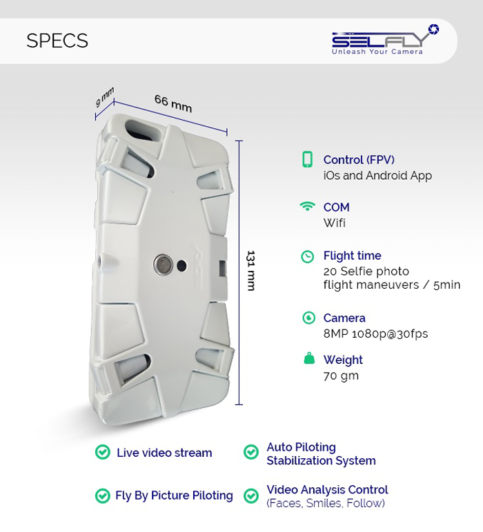 To control it, there are two methods. The first one is “Fly By Stick” which you can use stick controls on your smartphone or use the gravity sensors of the phone. The second methods is called “Fly By Picture” by manipulating the picture on the screen and the Selfly will work accordingly as claimed by the Selfly team. They plan to make it an open source thing so other developers can build on it and share their improvements.