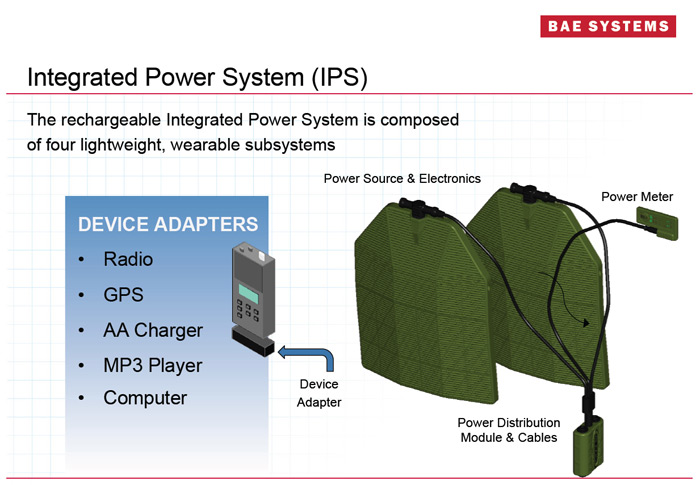 What they did is to integrate components for different purposes into single packages. The armor plates can also be a source of power for the electronics sytems and with adapters, you can connect the electronic equipment to draw power from. You eliminate batteries all over the soldier's pockets, and they also have different battery sizes. And it will serve its original as an armor plate to protect the soldier from projectiles.
