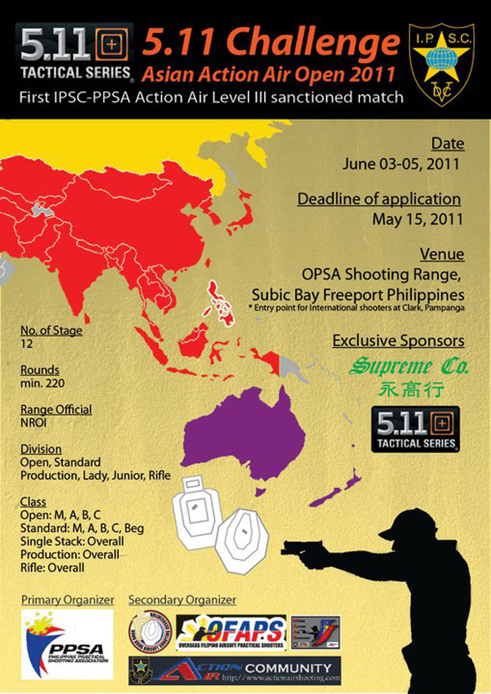 Applications for interested tournament participants is now closed, as the deadline for application was on the 15th of May 2011. But if you are interested to observe how Action Air tournaments are conducted, you are free to travel to Subic and watch how some of the best Action Air shooters in the world prove their mettle.