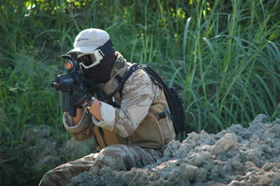 Probably the most common mistake we see among airsoft players is that they fail to maintain a firm grip on their guns. The hands—both of them—should maintain a firm firing grip on the gun, pulling it straight back into the shoulders. This should be maintained in any firing position. A very common error is to relax when kneeling or prone or shooting at distance—thereby losing shot group consistency. Consistency is the key to accuracy. Dot it the same way every time and you will not need to adjust or readjust when transitioning from one position to the next.