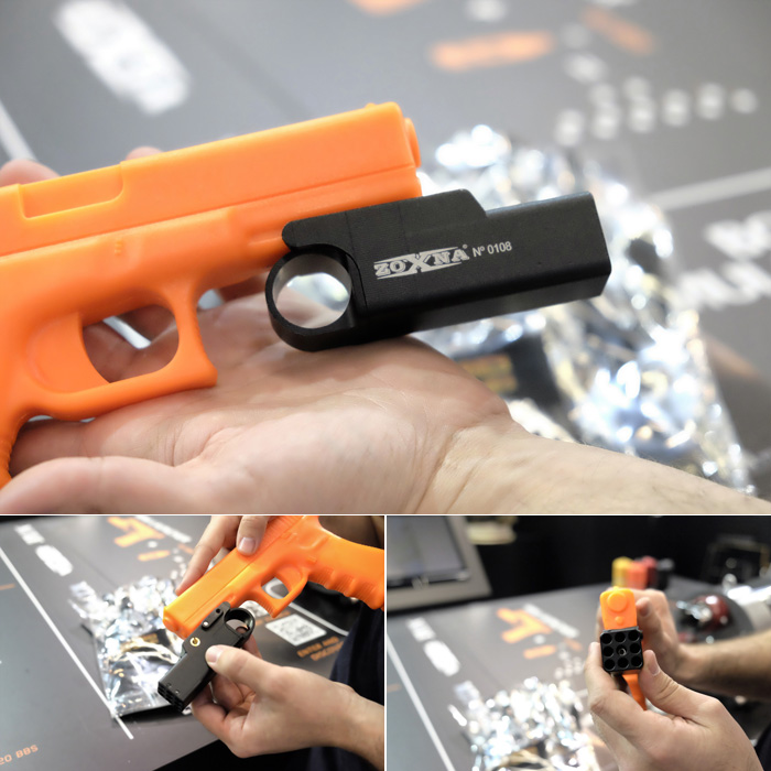 Another interesting product is Zoxna Mini Launcher. Mount it to your pistol or rifle, the Mini Launcher is a weapon of last resort when you are out of ammo, or when you can’t find time to quickly reload. Just pull the ring and fire away. 40 BBs can be launched that you can take out a two or three man team with it.