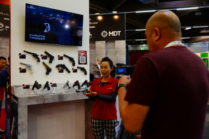 After King Arms, we moved to ICS Airsoft, finding Alice Chen to inform us that their presentor, Lee Morante was ready to show their offerings for this year. ICS Airsoft also have branched out into airsoft pistols, with their Black Leopard line-up and they will be producing even an airsoft Makarov. What is also interesting with ICS Airsoft is that they have a new member in the CXP family, which they first revealed in the real world at the IWA Outdoor Classics 2017, the ICS CXP-M.A.R.S. or the Modern Assault Rifle System Series. They have four different models and two colour schemes and they sport a LVOA-style handguard and feature the ICS Airsoft Transform4 system.