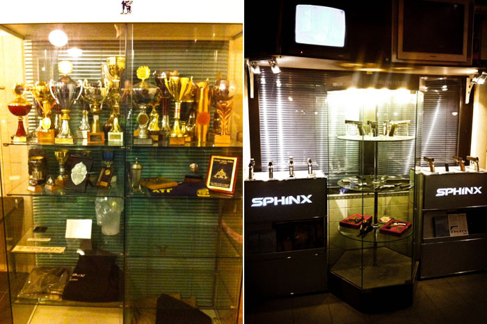 We arrived at the SPHINX factory on Friday morning 10am at the factory, to which I might point out is small and I drove past it like an idiot looking for this big place and had to turn around and come back. Christophe greeted us and led us downstairs to a small cafe-type bar area where they relax whilst looking onto their gun range. I mean straight away it was like Christmas had arrived --- glass cases with stunning custom and normal-crafted SPHINX pistols in them. We all had coffee and Christophe gave us some cool gifts and we also did the same for him and calmed down a little. But if I am honest it was hard to do in such a place like this with all those nice looking real steel guns that you can't wait to lay your hands on.