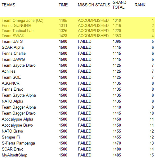 Teams OZ, Fenris GUNGNIR, Tactical Lab, and SWAK were the only teams to breach the fortress and proceed to the extraction point under the time limit of 15 minutes. Team SWAK put the heaviest pressure on all teams, by proving that the mission can be accomplished after several teams ahead of them all failed. The rest of the teams pushed harder as they can trying to beat Team SWAK, of which the top three teams eventually outpointed Team SWAK.