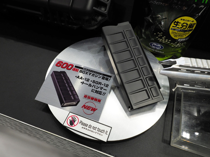 On display a the trade fair are mock-ups of future products from the company: Glock 19 3rd Gen, Colt M45A1, and the V10 Ultra Compact. All of these are gas blowback and we see these getting released next year. As for accessories, the 600-round box magazine for the SGR-12 and the AA-12 will soon be available. This does not show a window unlike the original magazine for these automatic electric shotguns.