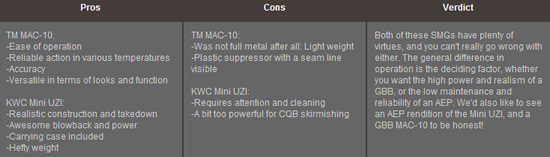 Making a choice between the KWC Mini UZI and the Tokyo Marui MAC-10 is not hard, if you already like one model better than the other. But if you're like Chuck Norris and are comfortable with either (or one in both hands), you should look at the things that set the models apart deeper than the surface.