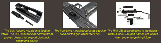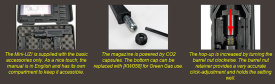 KWC is a fairly well known manufacturer of airsoft guns and other toys. Their products combine stable quality and good functioning with an affordable price. As a limiting factor they have no electric models in the line-up, but they have made some rather interesting gas operated rifles and submachine guns in the past with very simple gas systems, that borrowed some features from the classic "Bullet Valve" system, and had innovations made at KWC added to the mix. The more recent gas blowback pistols such as the P99 and 1911 series are more refined, as KWC have adopted a floating valve and other features from the reputable Western Arms Magna-Blowback into their pistols. The Mini UZI featured in this article features a floating valve actuated by a chambered BB, but the loading nozzle acts as a cylinder (rather than a Magna style piston), as found on the acclaimed Tokyo Marui GBB lineup.