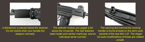 The stamped steel dust cover below the cocking handle features a warning text, that is in fact found on the real Mini UZI as well. There are variants that shoot from the open or closed bolt, as well as semi and select fire versions, and trying to modify one model into another configuration is indeed unsafe and illegal. (The KWC variant fires from a closed bolt and shoots semi and full auto.)