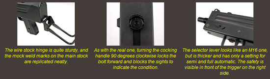 The metal cocking handle serves no other purpose than to retract the bolt to access the hop-up adjustment dial, but it does have one additional feature: Turning it 90 degrees clockwise locks it in position, and blocks the sight picture as well. On the real MAC-10 the ability to lock the bolt forward is an important safety feature: The weapon fires from an open bolt, so if it was carried decocked with a magazine attached, a knock from dropping the weapon could retract the bolt far enough to strip a round from the magazine, but not quite far enough to get caught by the sear. Bang! It should be noted that turning the cocking handle does NOT prevent the AEP from firing, so the feature is purely an ornamental one for the sake of realism.