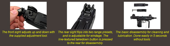The Mini UZI features improved sights over its predecessor, and they are actually quite good for SMG sights. The front sight is adjustable for elevation, and the rear sight has two aperture presets for range, and the windage adjustment. Sounds familiar? Well it's just like on the M16.