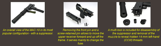 As a nice feature, the outer barrel of the MAC-10 is double-threaded. It has a large thread for the included foam-filled suppressor unit, but unscrewing the muzzle (with a tool that engages the mock rifling!) reveals a standard left-hand 14 mm thread, so you can attach a suppressor or flash hider of your choice. The tool doubles as a disassembly tool for the suppressor, in case you want to replace the foam baffles with a tracer unit for a cool tracer effect in the dark!