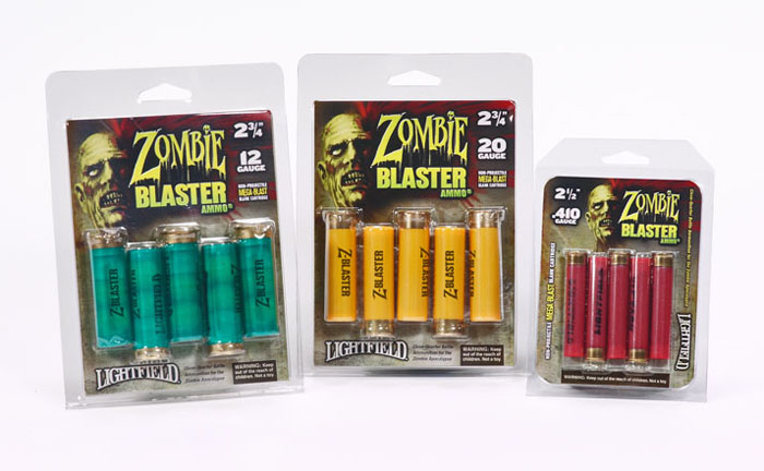 Adelphia, NJ – Lightfield Ammunition Corporation, the industry leader in big game hunting slug munitions, has announced the launch of a new line of Zombie ammunition. The new line is a non-projectile mega blank round thus called Zombie Blaster Ammo™. The Zombie Blaster is intended for close encounter combat with a Zombie (or several when the apocalypse happens). Don’t let the non projectile mega blank fool you, the new ammo packs a huge muzzle flash along with such an intense concussion punch it will deafen, blind and then knock the brains right out of a Zombie… guaranteed!