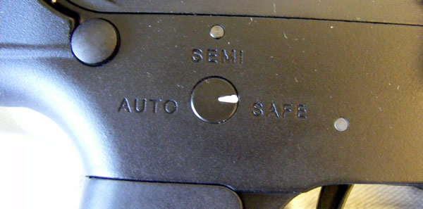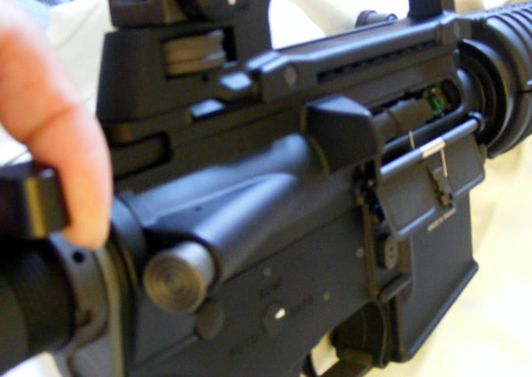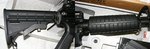It has a collapsible M4 stock, and with adjustable front and rear sights. The carry handle is the M4 removable, and the handguard is what you will expect in M4 AEGs -- it is where you place the batteries inside. Sling mounts are in the rear and front, and the dust cover is open, showing some good quality material inside. The receiver on the left side shows the fire selector switch for safe, single, and full-auto firing, the US Special Forces 1ST SFOD-D marking, and manufactured by Top Tech Taiwan information. On the right side of the receiver, you'll just see a simple "TOP TECH Made in Taiwan" marking. The photos themselves can attest to the to our first impression of great build quality. We'll give 4-stars to Top Tech here, as we could have preferred that Top Tech names a little bit more subtle rather than being too obvious, in the spirit of realism.