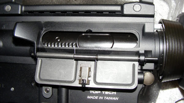 Take down is still the usual M4 TM-compatible type approach --- you always start with the stock, then slowly work your way to the pistogrip, motor housing, detaching motor, then removal of the upper and lower receivers, so there's nothing much new for you to learn, if you already have worked on taking apart M4 AEGs. But please take note that you cannot totally remove the pins, which we don't mind at all, since you won't lose the pins once you put everything back together again. When you remove the M4 carry handle from the upper receiver, you'll notice the nicely marked G&G markings, just a reminder for you who is the big daddy of Top Tech.