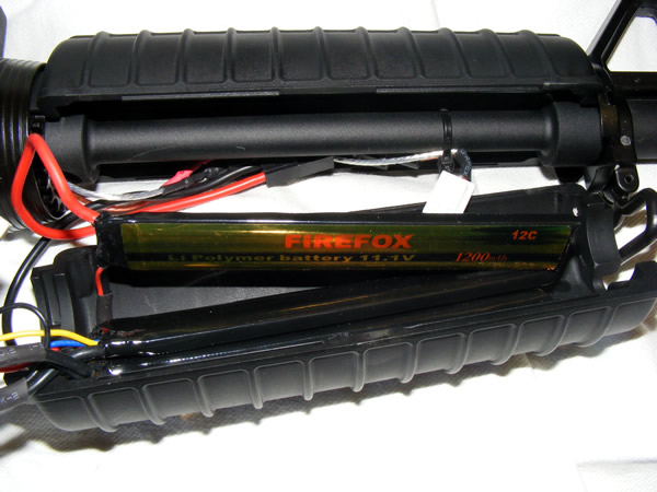 When you move the fire selector switch, it also moves on the right side of the receiver as well and indicates it so so you will be able to check it on the right side what your firng mode is, but this is not an ambidextrous switch. You'll just see it pivot when making the selection. Now, inserting the battery requires you to remove the handguard. You'll notice the wiring is of high-quality and silver-plated. Just insert the tamiya connector and you're good to go. Using Li-poly 11.1m which fits well inside, the chrono readings were consistent at 321fps. Pull the charging handle and the dust cover opens. Pulling the charging handle again, the hop-up adjustment is revealed, which is basically green in colour. Firing the AEG, it was consistent and no misfeeds with the high-cap magazine that came with it.