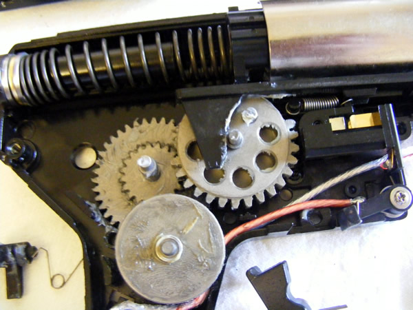 The gearbox, is what we'd rather call a a Camelback Version 2 Gearbox, since it has a hump which reminds us of a camel. The hump is actually the housing for the Pneumatic blowback, so that means opening the gearbox requires you to know a little bit more, it's not the usual version 2 animal. The Pneumatic blowback is connected to the dust cover which of course, provides the blowback effect.