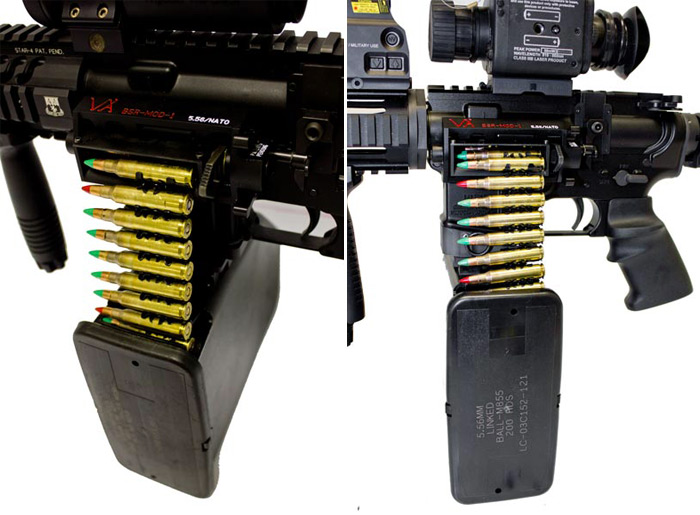 Valkyrie Armament answers the problem by improving on the AR-10 belt system by providing a conversion kit that will allow an AR-15 ready to take in an M249 belt feeding magazine. The magazine can be placed to feed the AR-15 by pulling the take down pin at the rear of the receiver, pushing the magazine release, place the belt feed, and close the rifle. Just like handling a SAW with a smaller tool.