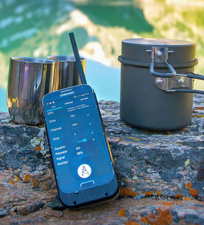 It's a casing with a built-in 2000mah battery to double battery life and a retractable antenna to which you install your Smartphone on. With its proprietary software, it becomes a peer-to-peer communications platform that allows Push-To-Talk (PTT) voice comms, messaging, and geolocation. All of these features can be used without the need of a cellular or Wifi connection unlike other mobile apps such as Voxer or Viber. For now it supports the Apple iPhone 5 and later versions; and the Samsung Galaxy S4 and S5 phones.