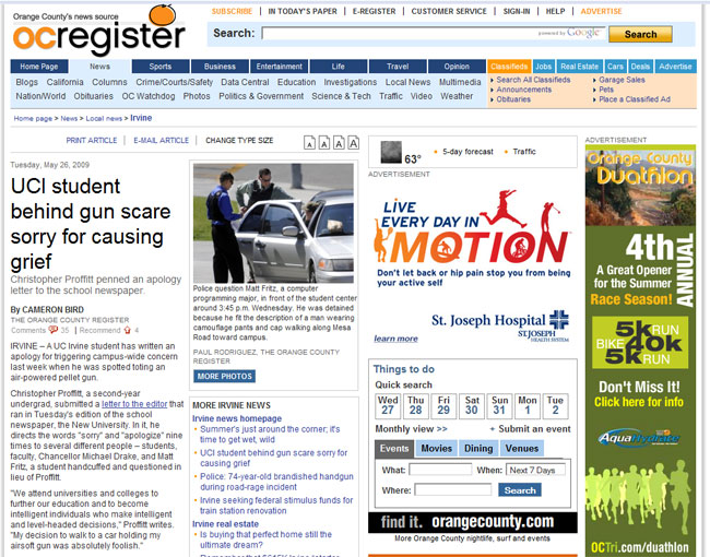 This is a follow-up on the story as spread around by MadBull and Stryke Airsoft regarding the incident at University of California - Irvine (UC Irvine) that happened last week which was posted by Optimus Prime last Monday. The student concerned sent a letter to the editor to the New University, the student publication, expressing that he is sorry to the community and to the students who were affected by the incident, especially, the student who got handcuffed for questioning, instead of the author of the letter. It's better late than never to show remorse for such irresponsibility, and while you might think it may not be enough, the first step should always be an act of contrition.