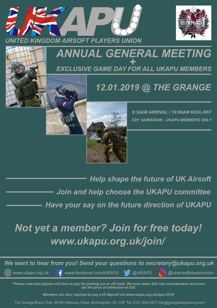 The United Kingdom Airsoft Players’ Union (UKAPU) will get down to business immediately at the start of 2019 as they call for their Annual General Meeting on the 12th of January 2019. To be held at The Grange in Birmingham, it’s a reunion, meeting, and an airsoft game at the same time.