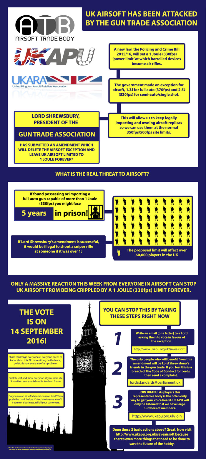 In a call to action by the United Kingdom Airsoft Players Union (UKAPU), the Airsoft Trade Body (ATB) and United Kingdom Airsoft Retailers Association (UKARA), airsoft players in the UK are enjoined to write to the House of Lords to preserve the Airsoft Exception in the Policing & Crime Bill 2016 (PCB). In a development that many are wondering about, the Earl of Shrewsbury, who is the president of the Gun Trade Association (GTA), has tabled an amendment removing the exception to Airsoft from the firearms laws.