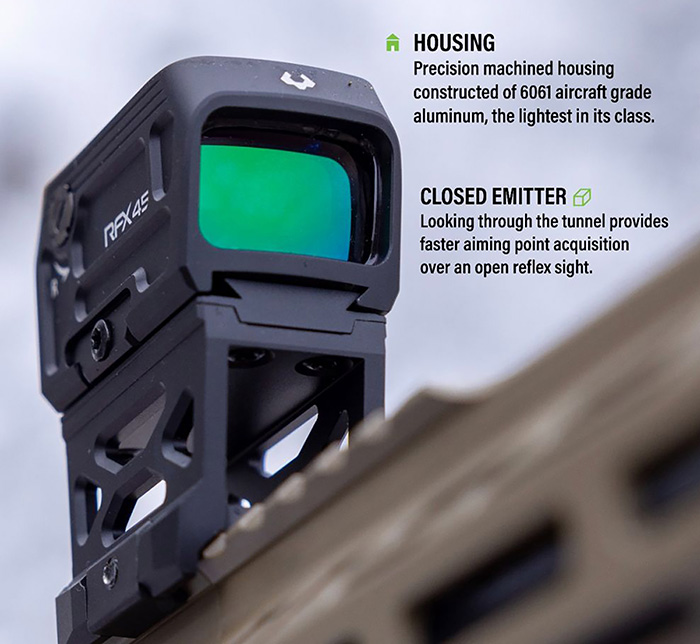 If you are looking for a green dot sight that works with both pistols and rifles, you might want to check out the RFX45 from Viridian Weapon Technologies. This is a closed emitter optic that was first shown at SHOT Show 2023 and is now on the market.