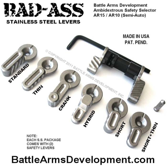Enter the Battle Arms Development - Ambidextrous Safety Selector (BAD-ASS) a set of levers designed for the AR Platform. These are not actually a new development, but not much discussed as more attention to other parts of the rifle such as the front and rear areas. Rarely has the fire selector switch been given some loving detail and with the BAD-ASS, you get an ambidextrous lever set and you get to choose which lever you want to use each time.