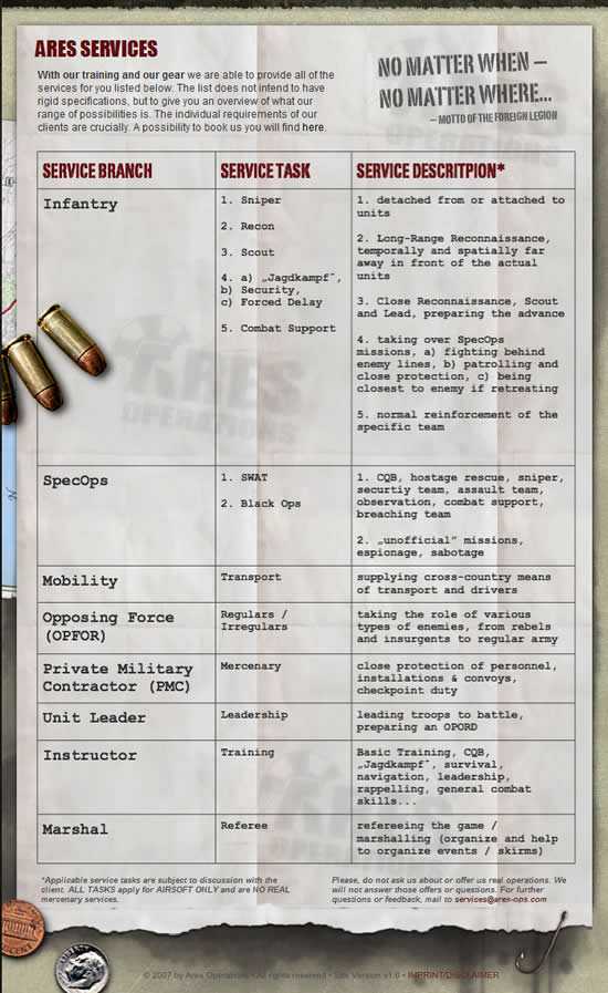 We are no mercenary re-enactors, meaning that we do not play mercenaries – Ares Operations considers itself as a real service provider and therefore can be “hired” for real.
