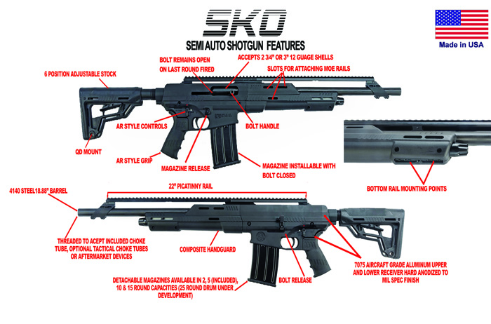 The SKO accepts 2 ¾” and 3” shells and can be fed with magazines up with capacities of up to 10 shells and a 25-shell drum magazine. In short, it has features seen in the AA-12 which is also magazine fed. The AES technology of Tokyo Marui was developed for magazine fed shotgun designs.