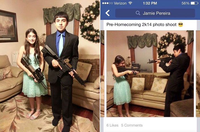 We understand the need of schools to be vigilant given that incidents of mass shootings in the USA happen in schools. We all need to be on the lookout to threats to children, wherever in the world and try to prevent these. We also know that some suspects in recent mass shootings posted threatening stuff on social media. But the photos of this very young couple don't even indicate they are planning to massacre students at a school dance, they were just being goofy.